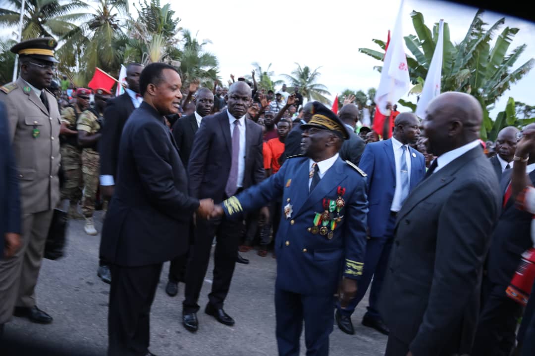 L’avion transportant le couple présidentiel s’est immobilisé sur le tarmac de l’aéroport international A.A. Néto de Pointe-Noire peu avant 17 heures. La pluie qui a arrosé le sol de la ville océane en matinée avait la place au soleil. Au pied de l’avion, le président de la République et son épouse sont accueillis par le Préfet du département de Pointe-Noire, Alexandre Honoré PAKA. Puis, le président de la République a passé en revue les troupes de la Garnison de Pointe-Noire rangées pour la circonstance. Ces deux phases ont précédé par l’accueil des corps constitués nationaux dont les parlementaires des départements de Pointe-Noire et du Kouilou et les membres du gouvernement en tête desquels le premier ministre.